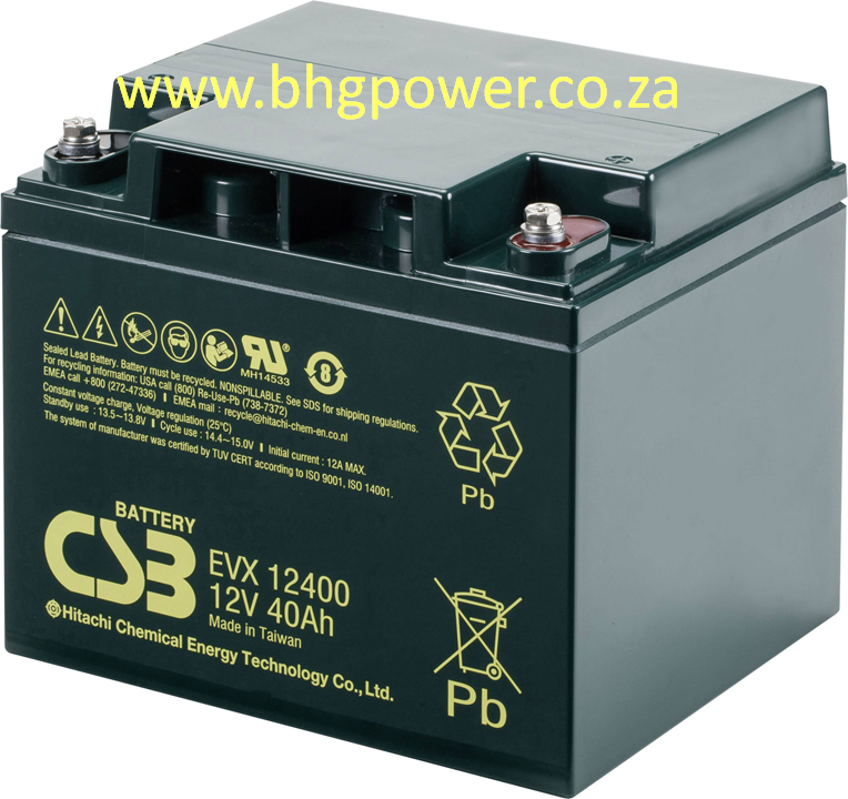 CSB EVX 12400 Battery is a backup battery used for portable equipment and office and factory automation. The battery also working in conjunction with solar cells to make a decentralized power supply system. CSB Battery is small and lightweight that gives high performance making it very economical to use. In addition to these advantages, the sealed construction eliminates the necessity to fill the battery with water.